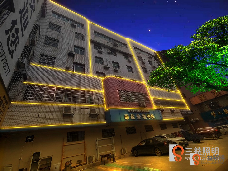 桃江縣公安交警大隊、事故入處理中心外墻燈光設計方案,采用線條燈勾勒大樓輪廓。